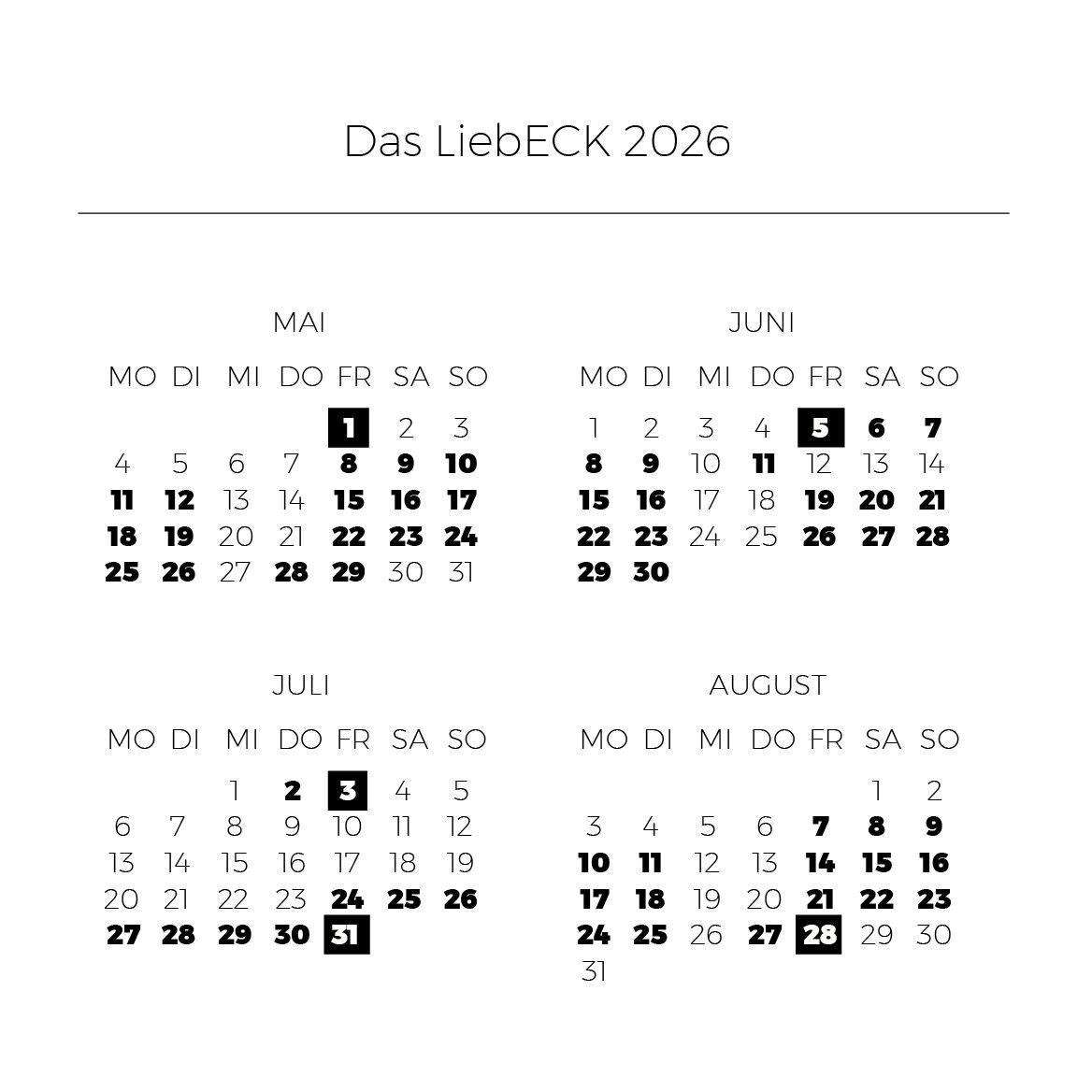 Wir freuen uns, Sie an den fett markierten Tagen bei uns im LiebECK begrüßen zu dürfen. Unsere Küche nimmt Ihre Bestellung gerne bis 14:00 Uhr bzw. bis 20:30 Uhr entgegen. Aufgrund der begrenzten Anzahl an Sitzplätzen bitten wir um Ihre Reservierung.